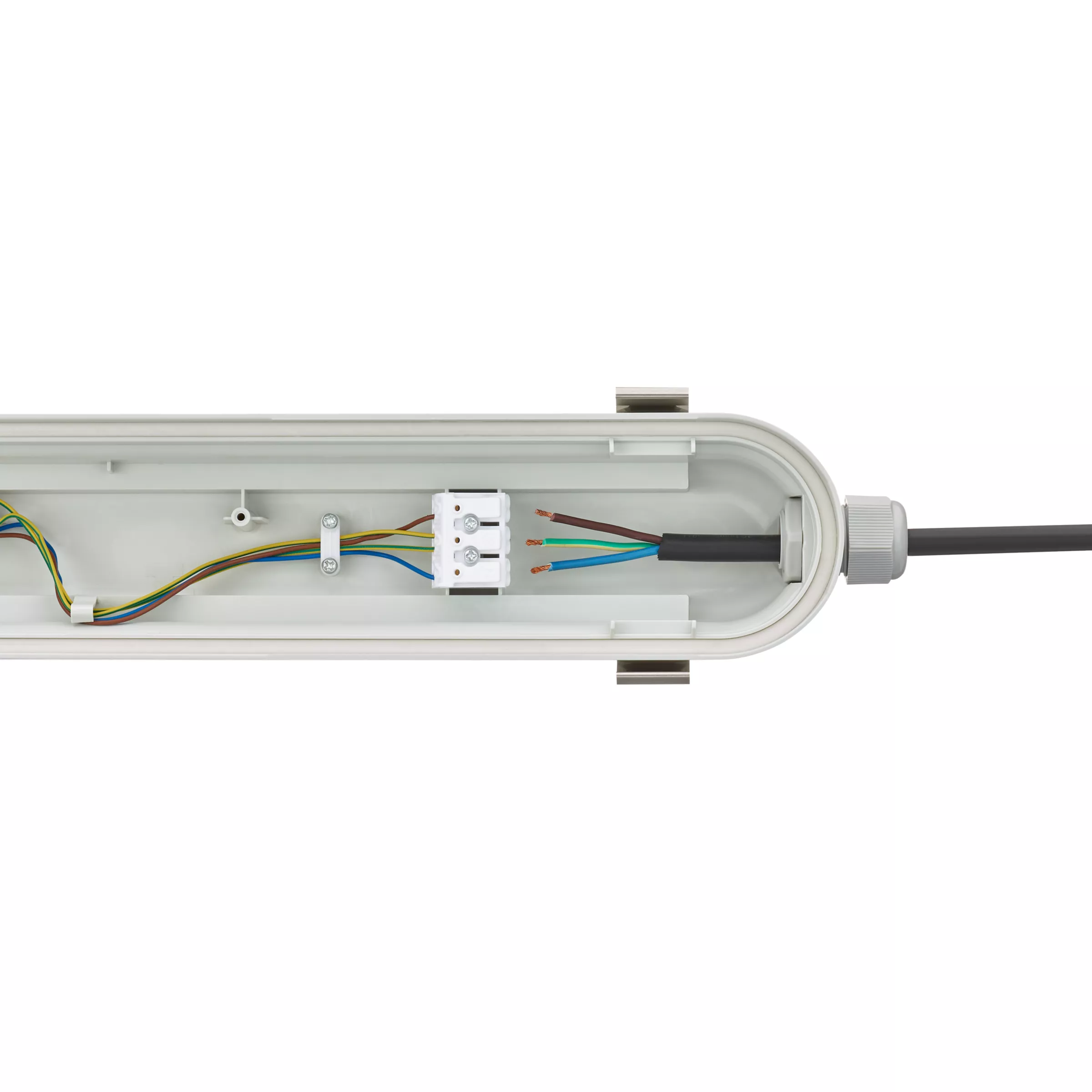 L1500 mm, poliwęglan, Szary, Zasilacz (wł./wył.), 8000 lm, 57 W, 140 lm/W, 4000 K, (0.38,0.38)SDCM=3, Kąt rozsyłu światła 110°, Matowe, poliwęglan, IP65 | Zabezpieczone przed przenikaniem kurzu, strugoodporne, IK08 | 5 J ochrona przed wandalami, Klasa bezpieczeństwa I, Szybkozłączka 5-biegunowa, Okablowanie przelotowe 3-fazowe