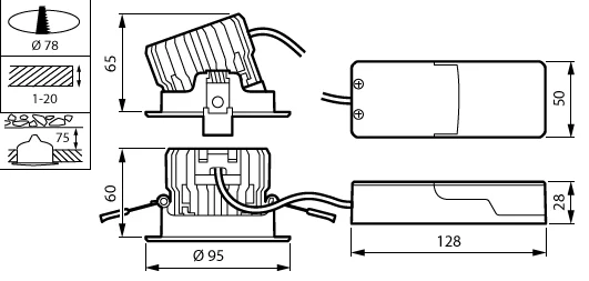 CoreLine Recessed Spot gen2, Adjustable, D78 mm, Odlew aluminiowy, Aluminium, Zewnętrzny zasilacz zregulacją, 1200 lm, 12.3 W, 98 lm/W, 4000 K, (0.38, 0.38) SDCM 5, Szeroki rozsył światła, poliwęglan, IP20/44 | Ochrona przed dotknięciem palcem; ochrona przed przewodami, bryzgoodporne, IK03 | 0,3 J, Klasa bezpieczeństwa II, Przewód 0,25m ze złączką 3-biegunową, Szybkozłączka 3-biegunowa