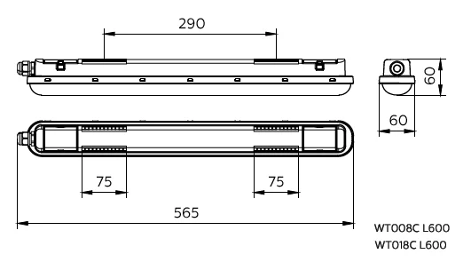 Waterproof, L600 mm, poliwęglan, Szary, Zasilacz (wł./wył.), 2000 lm, 18 W, 111 lm/W, 4000 K, (0.38,0.38)SDCM=6, Symetryczna, Opalizowany, poliwęglan, IP65 | Zabezpieczone przed przenikaniem kurzu, strugoodporne, IK08 | 5 J ochrona przed wandalami, Klasa bezpieczeństwa II, Szybkozłączka 2-biegunowa