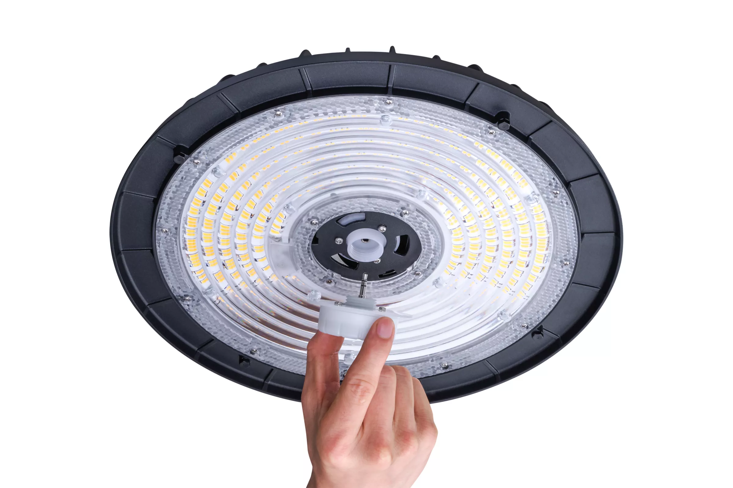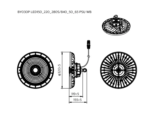 ɸ320 mm, Odlew aluminiowy, Aluminiowy iczarny, Kruczoczarny (RAL9005), Jednowarstwowe malowanie proszkowe, Podwieszane, Zasilacz, All-in, Multi Lumen, All-in, Multi Color Temperature, 15000 lm, 22000 lm, 28000 lm, 195 W, 145 W, 100 W, 152 lm/W, 142 lm/W, 4000 K, 5000 K, 6500 K, (0.38, 0.38); (0.31, 0.34) SDCM≤5, Symetryczna, Przezroczyste, poliwęglan, IP65 | Zabezpieczone przed przenikaniem kurzu, strugoodporne, IK07 | 2 J wzmocniona, Klasa bezpieczeństwa I, Złączka śrubowa