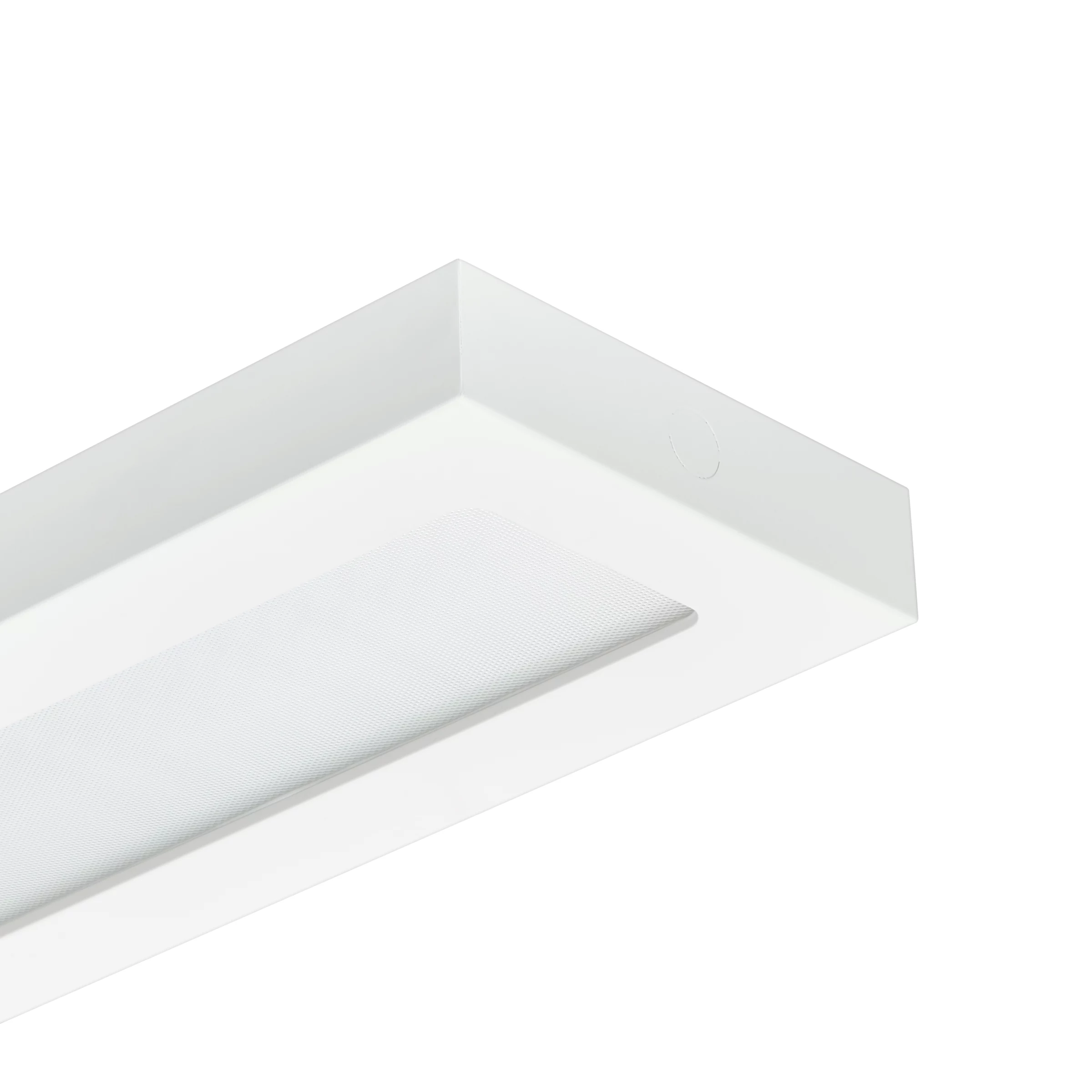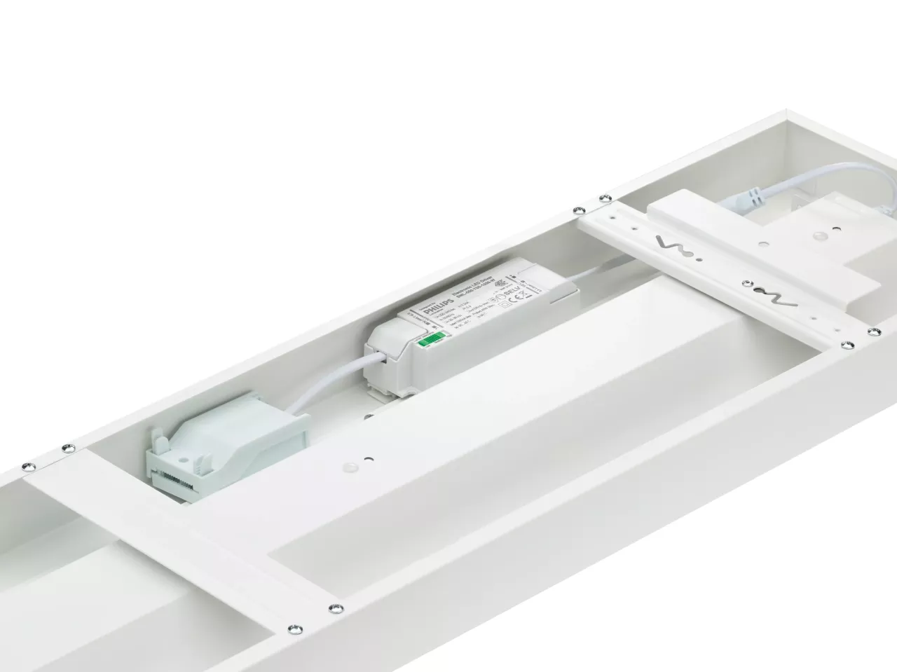 200x1200 mm, Stal, Biel, Sygnałowy biały (RAL9003), Na powierzchni, Zasilacz (wł./wył.), All-in, Multi Lumen, 3600 lm, 4500 lm, 6000 lm, 38.5 W, 23 W, 157 lm/W, 155 lm/W, 4000 K, (0.38.0.38)SDCM3, UGR19, Szeroki rozsył światła zgodny znormami dla biur, Soczewka mikropryzmatyczna, poliwęglan, IP20/44 | Ochrona przed dotknięciem palcem; ochrona przed przewodami, bryzgoodporne, IK03 | 0,35 J wzmocniona, Klasa bezpieczeństwa II, Przewód ze złączką 3-biegunową, Szybkozłączka 3-biegunowa