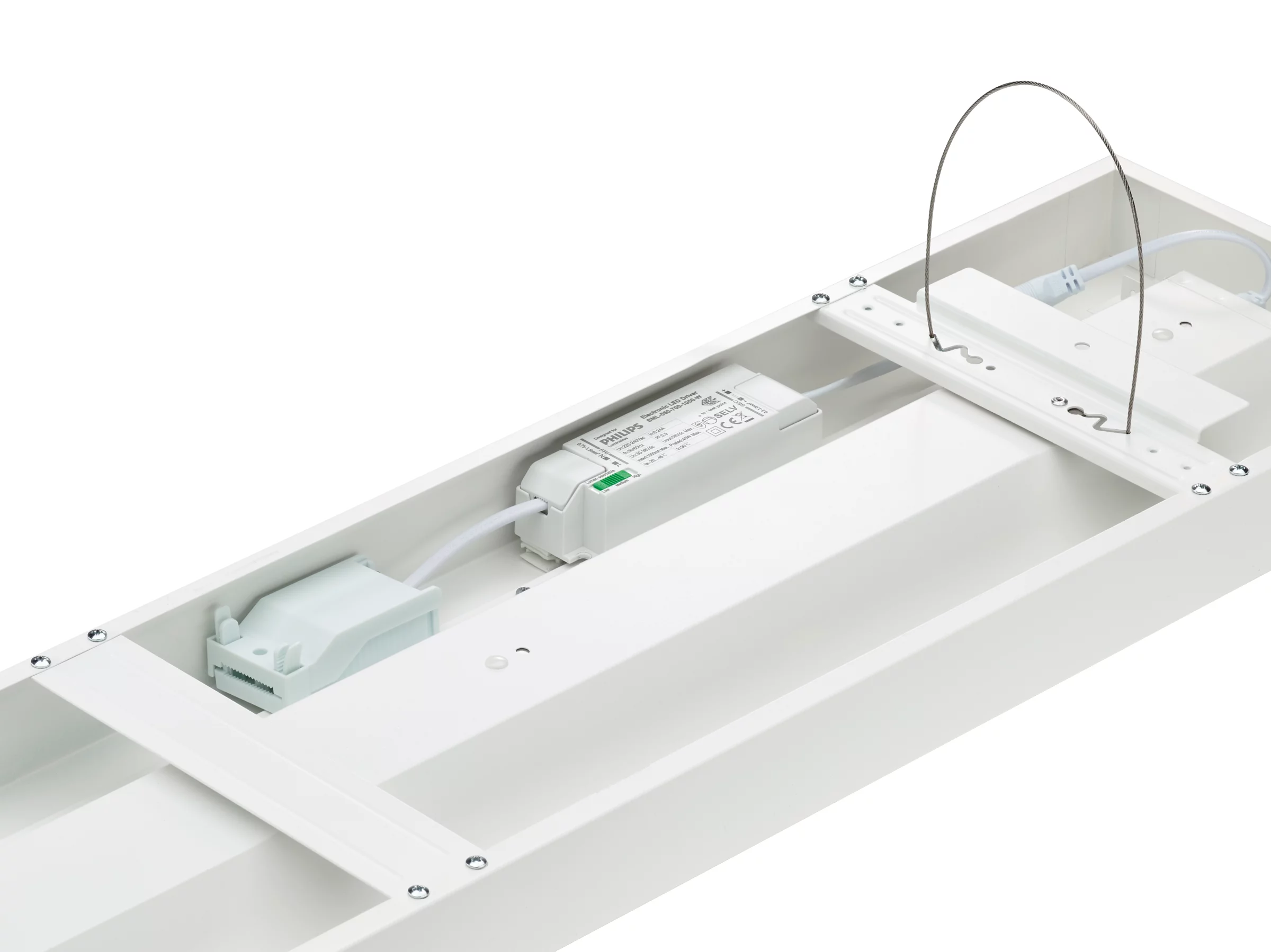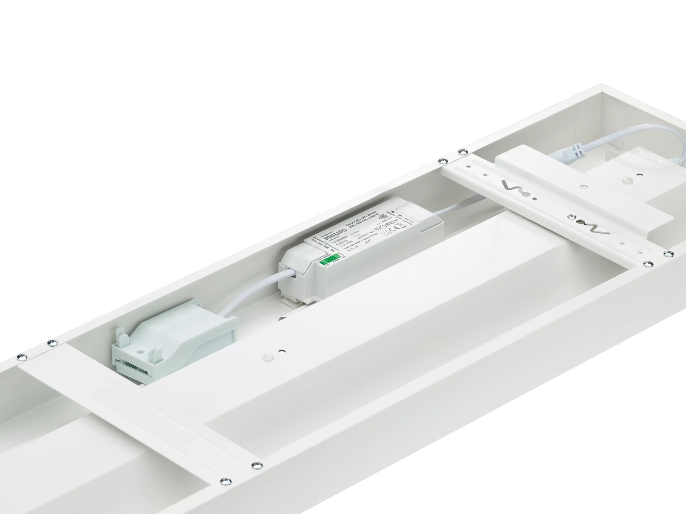 200x1570 mm, Stal, Biel, Sygnałowy biały (RAL9003), Na powierzchni, Zasilacz (wł./wył.), All-in, Multi Lumen, 3400 lm, 4300 lm, 6500 lm, 43.5 W, 22.5 W, 151 lm/W, 148 lm/W, 3000 K, (0.44,0.40)SDCM3, UGR19, Szeroki rozsył światła zgodny znormami dla biur, Soczewka mikropryzmatyczna, poliwęglan, IP20/44 | Ochrona przed dotknięciem palcem; ochrona przed przewodami, bryzgoodporne, IK03 | 0,35 J wzmocniona, Klasa bezpieczeństwa II, Przewód ze złączką 3-biegunową, Szybkozłączka 3-biegunowa