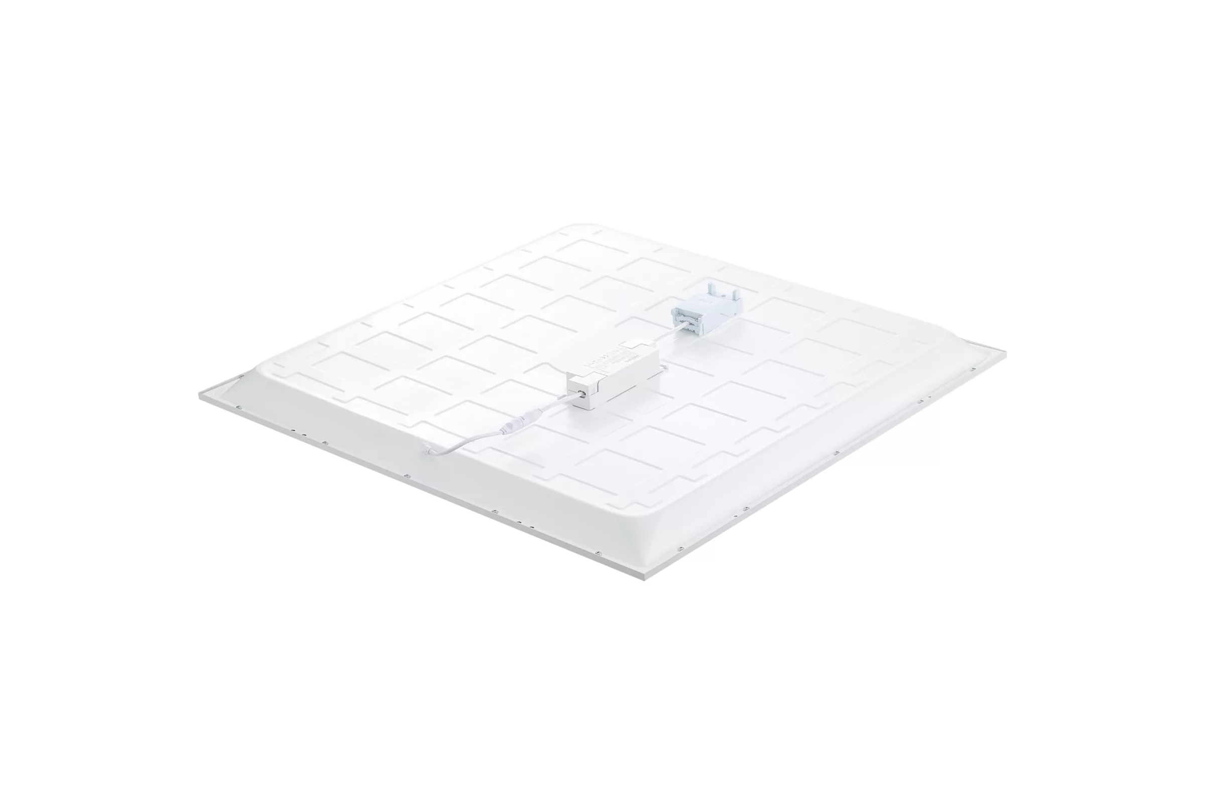 600x600 mm, Visible profile ceiling version, Stal, Biel, Sygnałowy biały (RAL9003), Zewnętrzny zasilacz (wł./wył.), 3400 lm, 28 W, 120 lm/W, 4000 K, (0.38, 0.38) SDCM ≤5, Kąt rozsyłu światła 120°, Soczewka mikropryzmatyczna, Akrylowe, IP20/40 | Ochrona przed dotknięciem palcem; ochrona przed przewodami, IK02 | 0,2 J standardowa, Klasa bezpieczeństwa II, Szybkozłączka 3-biegunowa, SC | Linka zabezpieczająca
