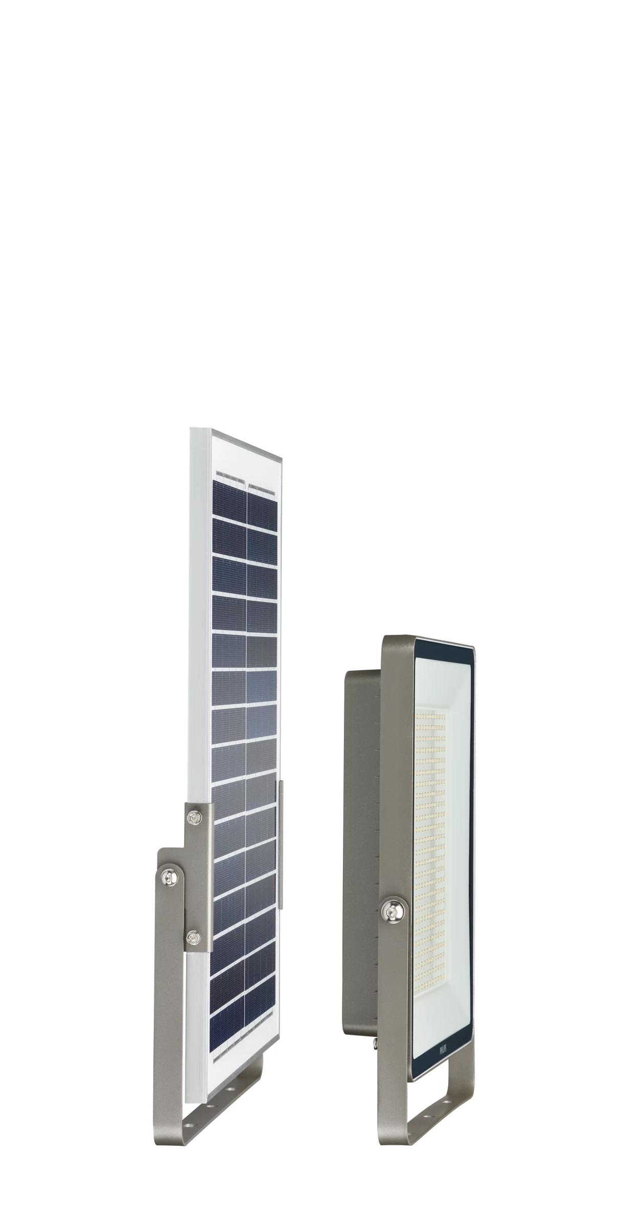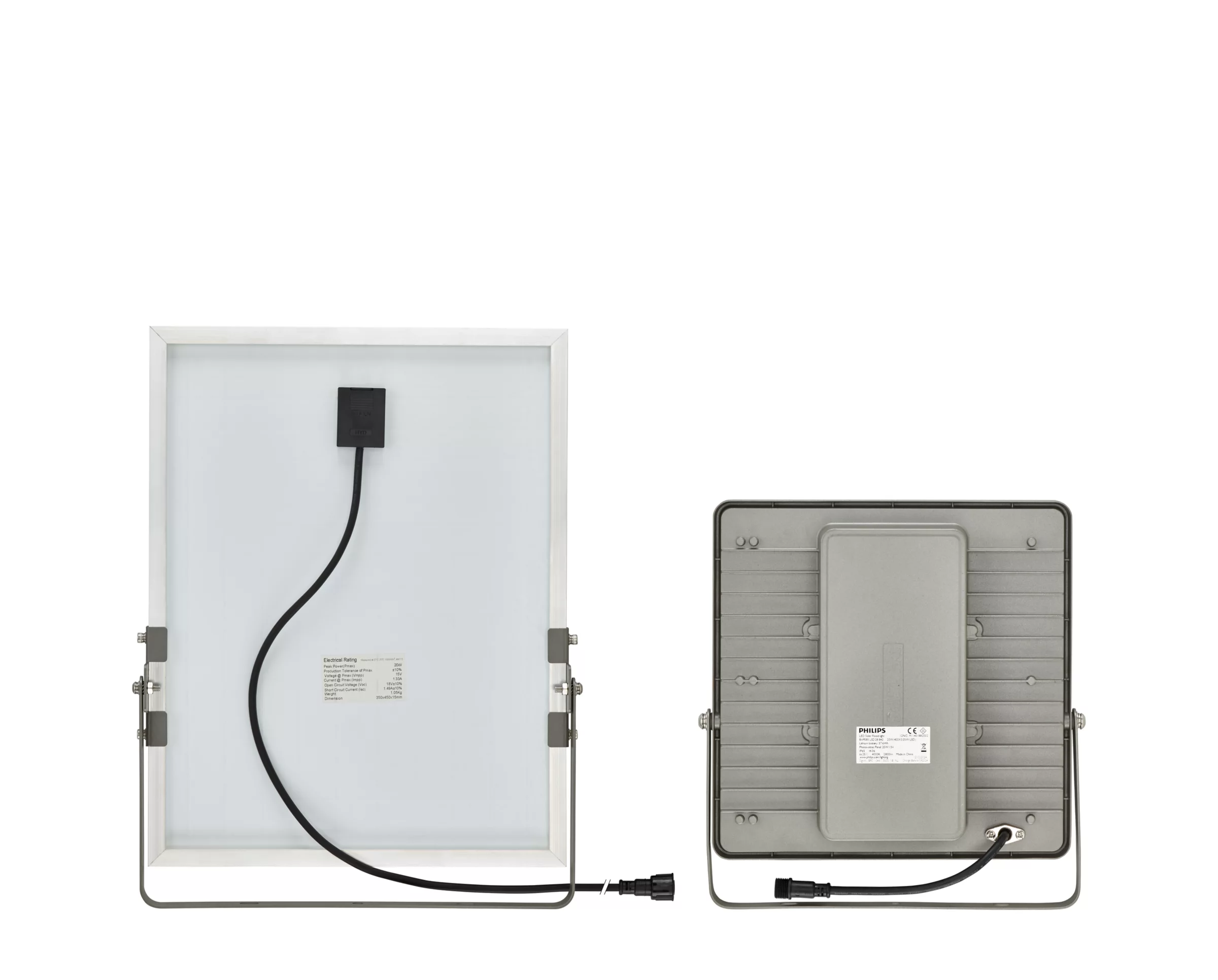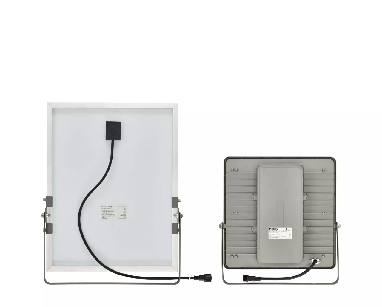 Naświetlacze Ledinaire Solar, Aluminium, Szary, Jednowarstwowe malowanie proszkowe, Sterownik zintegrowany z tablicą LED (DoB), Profil ściemniania oświetlenia zasilanego energią słoneczną w wersji 1, 2600 lm, 20 W, 130 lm/W, 3000 K, (0.312,0.332) SDCM=5, CRI80, Symetryczna, IP65 | Zabezpieczone przed przenikaniem kurzu, strugoodporne, IK06 | 1 J, Klasa bezpieczeństwa III, Poziom ochrony przeciwprzepięciowej do 1,5 kV w trybie różnicowym i 1,5 kV w trybie wspólnym, 2 × 0,75mm², Wodoszczelna zewnętrzna złączka 3-biegunowa