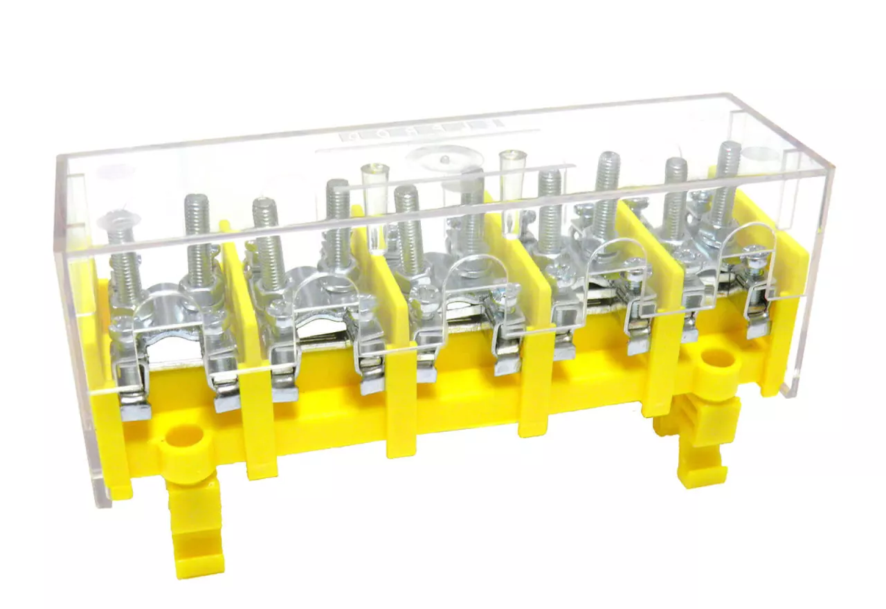 LZ 5*25/10wyk.22P żółty_Odgałęźnik instalacyjny 5-torowy 2x25²/4x10², na TS 35, z pokrywą