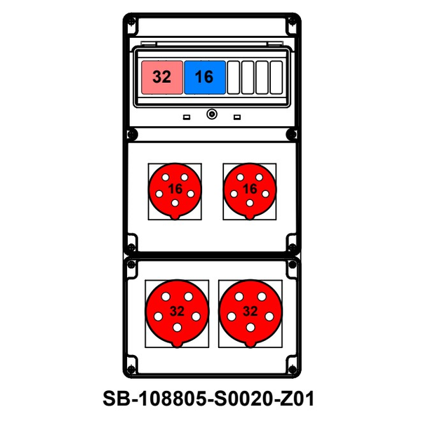 ROZDZIELNICA;C32-3P;C16-3P;2X5X32A;2X5X16A;INA=32A;IP54, SB-108805-S0020-Z01-54