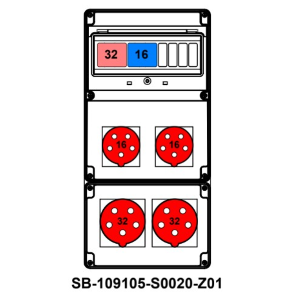 ROZDZIELNICA;C32-3P;C16-3P;2X5X32A;2X5X16A;INA=32A;IP54, SB-109105-S0020-Z01-54