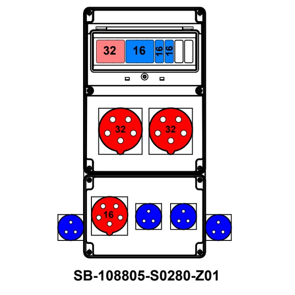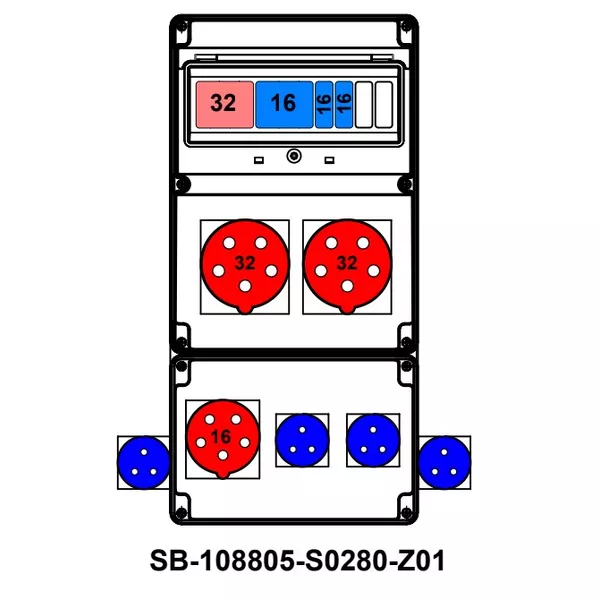 ROZDZIELNICA;C32-3P;C16-3P;2XB16-1P;2X5X32A;5X16A;4X2P+PE;INA=32A;IP54, SB-108805-S0280-Z01-54