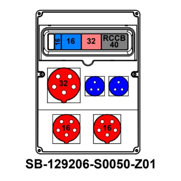 ROZDZIELNICA;RCCB40A;C32-3P;C16-3P;B16-1P;5X32A;2X5X16A;2X2P+PE;INA=32A;IP54, SB-129206-S0050-Z01-54