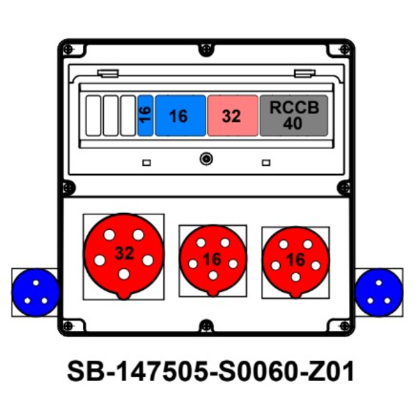 ROZDZIELNICA;RCCB40A;C32-3P;C16-3P;B16-1P;5X32A;2X5X16A;2X2P+PE;INA=32A;IP54, SB-147505-S0060-Z01-54