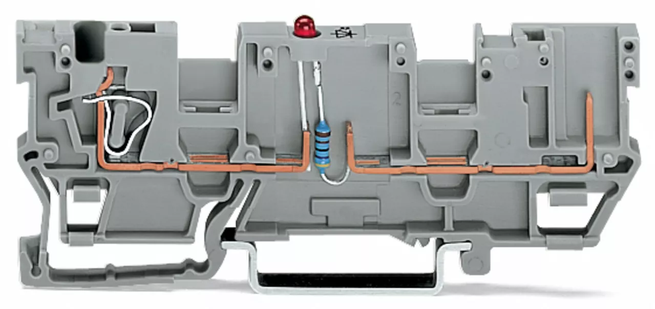 zł. baz. do zab. el. 1-przew./1-pinowa; z podwójnym mostkowaniem; LED czerwona; 24 V DC; na szynę TS 35 x 15 i 35 x 7,5; 4 mm²; CAGE CLAMP®; szary