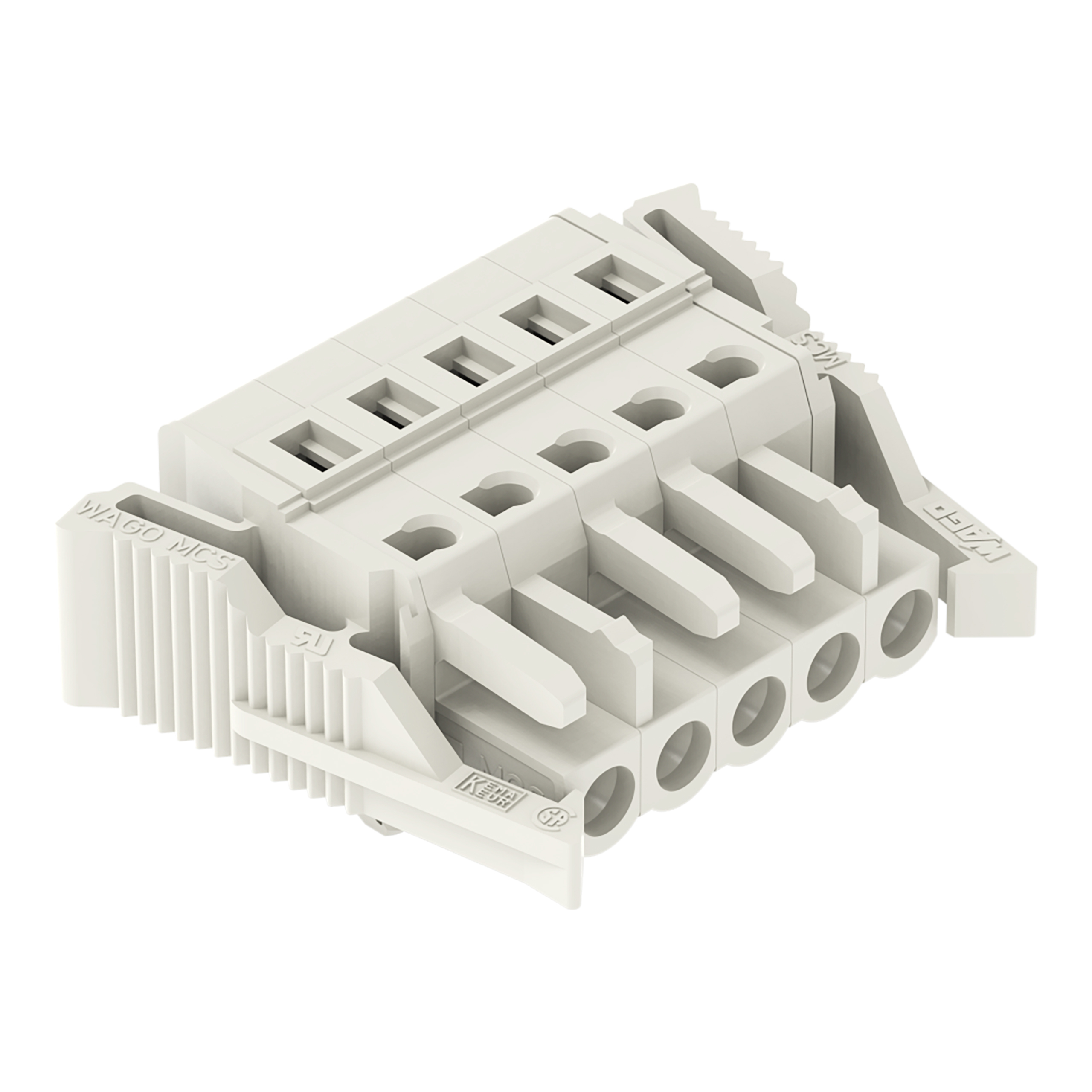 gniazdo 1-przewodowe; CAGE CLAMP®; 2,5 mm²; raster 5 mm; 5-bieg.; 100% ochrona przed błędnym połączeniem; boczne zaczepy ryglujące; stopki zatrzaskowe; 2,50 mm²; jasnoszary