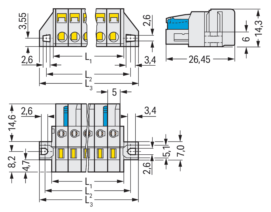 gniazdo 1-przewodowe; CAGE CLAMP®; 2,5 mm²; raster 5 mm; 8-bieg.; 100% ochrona przed błędnym połączeniem; kołnierz mocujący; 2,50 mm²; jasnoszary