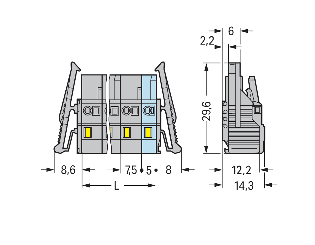 gniazdo 1-przewodowe; CAGE CLAMP®; 2,5 mm²; raster 7,5 mm; 10-bieg.; boczne zaczepy ryglujące; szary