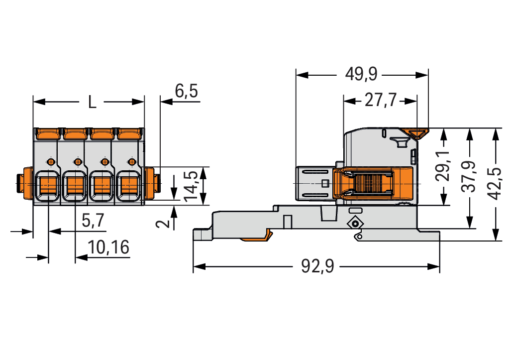 gniazdo 1-przewodowe; dźwignia; Push-in CAGE CLAMP®; 16 mm²; raster 10,16 mm; 3-bieg.; 100% ochrona przed błędnym połączeniem; boczne zaczepy ryglujące; TS 35/montaż na płycie; zestyki posrebrzane; 16,00 mm²; jasnoszary