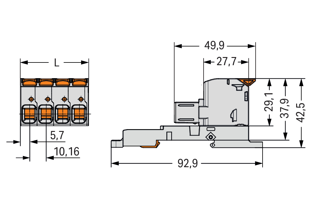 gniazdo 1-przewodowe; dźwignia; Push-in CAGE CLAMP®; 16 mm²; raster 10,16 mm; 5-bieg.; 100% ochrona przed błędnym połączeniem; TS 35/montaż na płycie; zestyki posrebrzane; 16,00 mm²; jasnoszary
