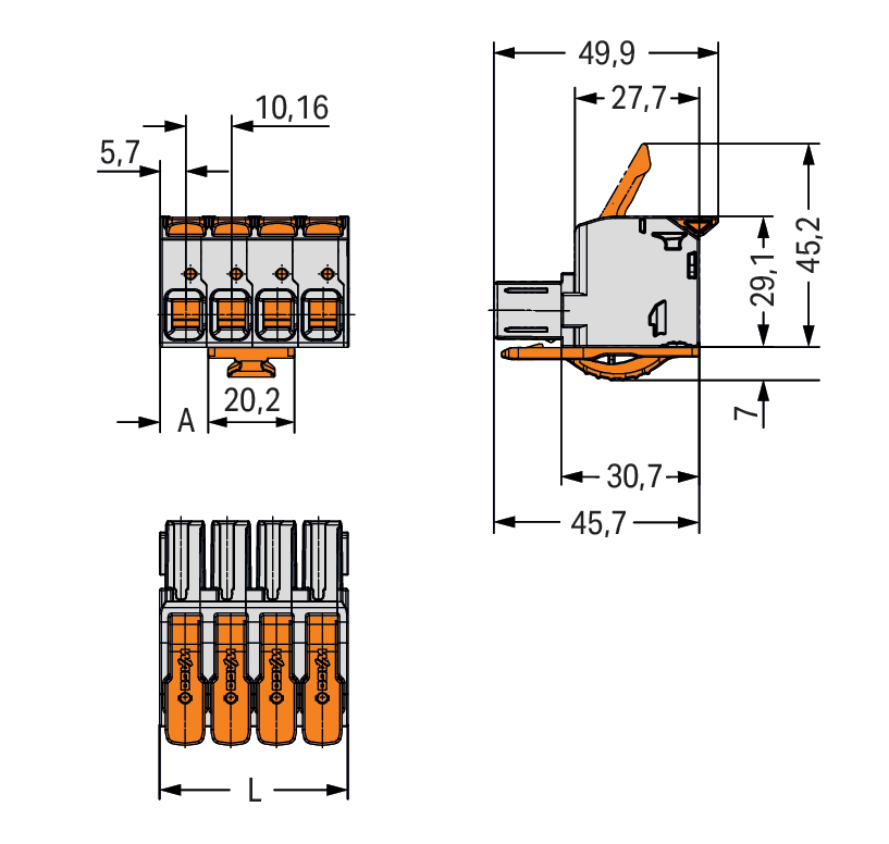 gniazdo 1-przewodowe; dźwignia; Push-in CAGE CLAMP®; 16 mm²; raster 10,16 mm; 5-bieg.; 100% ochrona przed błędnym połączeniem; środkowy zaczep ryglujący; zestyki posrebrzane; 16,00 mm²; jasnoszary