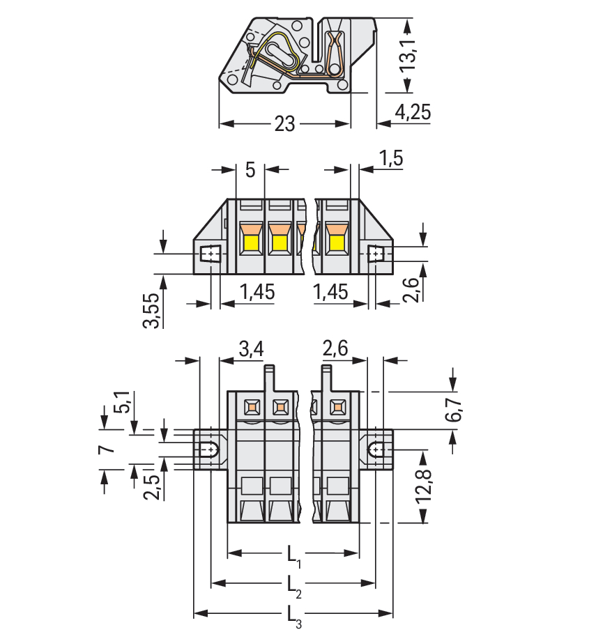 gniazdo 1-przewodowe kątowe; CAGE CLAMP®; 2,5 mm²; raster 5 mm; 2-bieg.; 100% ochrona przed błędnym połączeniem; kołnierz mocujący; 2,50 mm²; jasnoszary