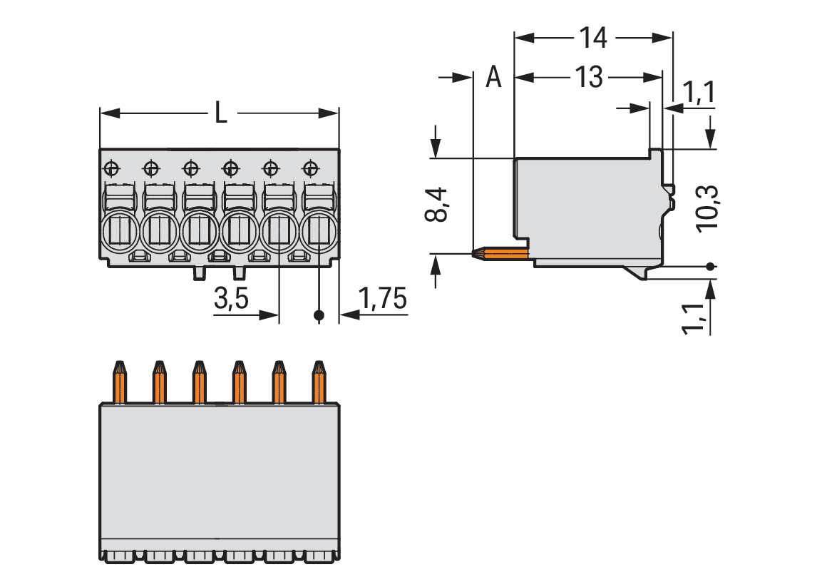 gniazdo THT 1-przewodowe proste; przycisk; Push-in CAGE CLAMP®; 1,5 mm²; raster 3,5 mm; 3-bieg.; pin lutowniczy Ø 1,0 mm; 1,50 mm²; jasnoszary