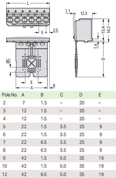 gniazdo 1-przewodowe; przycisk; Push-in CAGE CLAMP®; 2,5 mm²; raster 5 mm; 6-bieg.; płytka odciążająca; 2,50 mm²; jasnoszary
