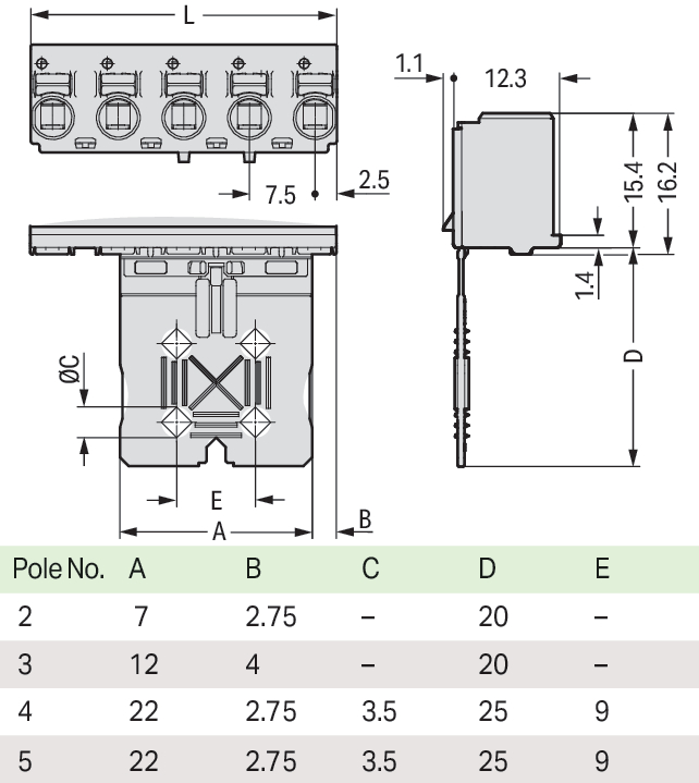gniazdo 1-przewodowe; przycisk; Push-in CAGE CLAMP®; 2,5 mm²; raster 7,5 mm; 5-bieg.; płytka odciążająca; 2,50 mm²; jasnoszary