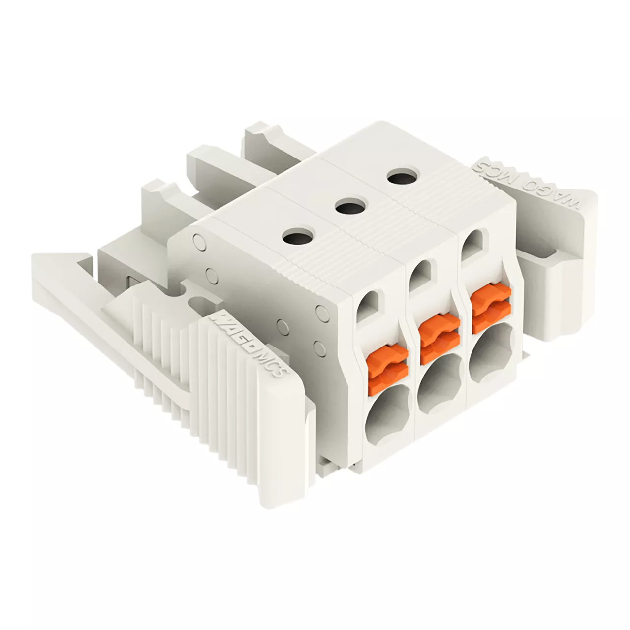 gniazdo 1-przewodowe; przycisk; Push-in CAGE CLAMP®; 2,5 mm²; raster 5 mm; 3-bieg.; 100% ochrona przed błędnym połączeniem; boczne zaczepy ryglujące; 2,50 mm²; jasnoszary