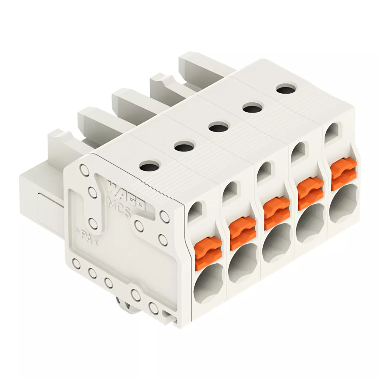 gniazdo 1-przewodowe; przycisk; Push-in CAGE CLAMP®; 2,5 mm²; raster 5 mm; 5-bieg.; 100% ochrona przed błędnym połączeniem; stopki zatrzaskowe; 2,50 mm²; jasnoszary