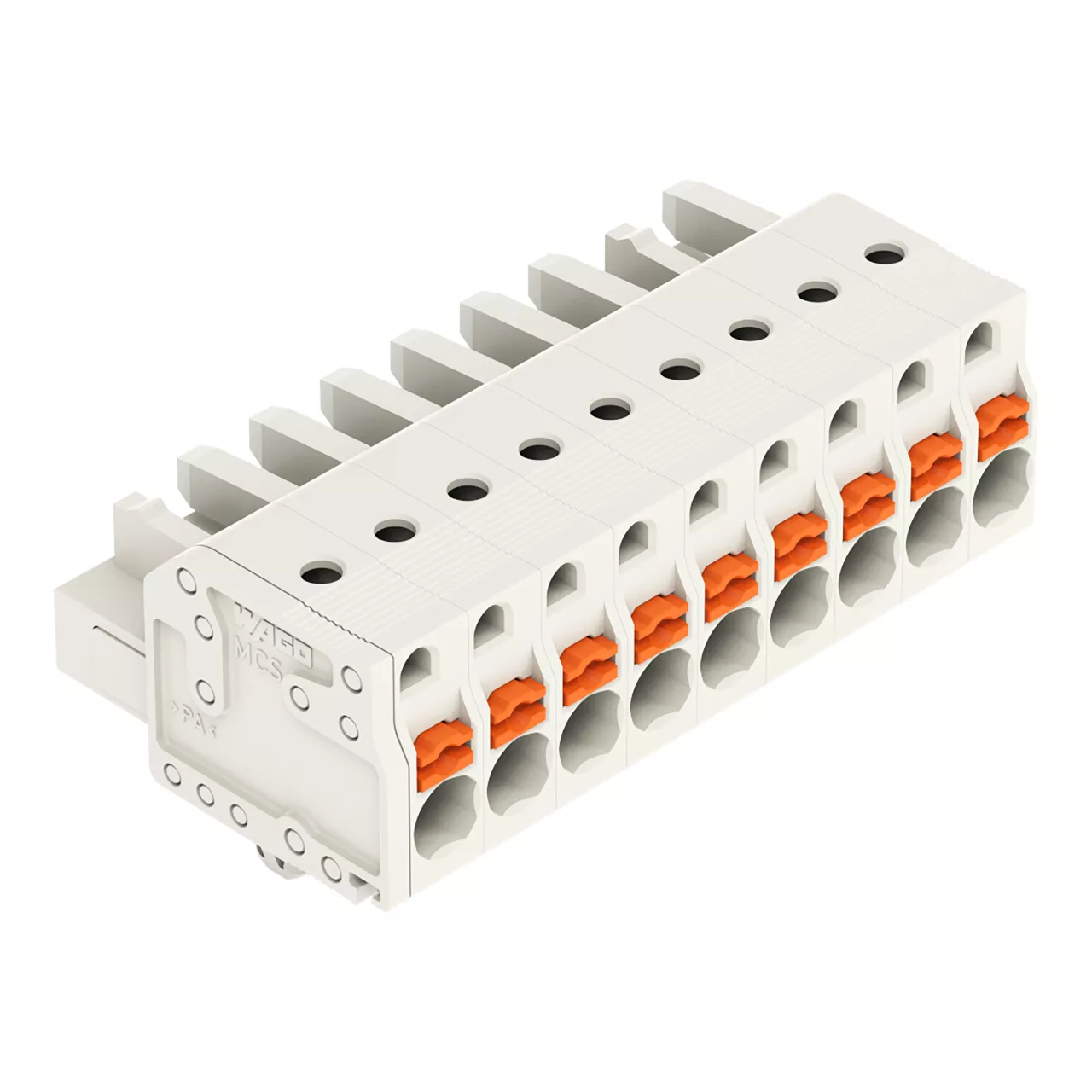 gniazdo 1-przewodowe; przycisk; Push-in CAGE CLAMP®; 2,5 mm²; raster 5 mm; 9-bieg.; 100% ochrona przed błędnym połączeniem; stopki zatrzaskowe; 2,50 mm²; jasnoszary