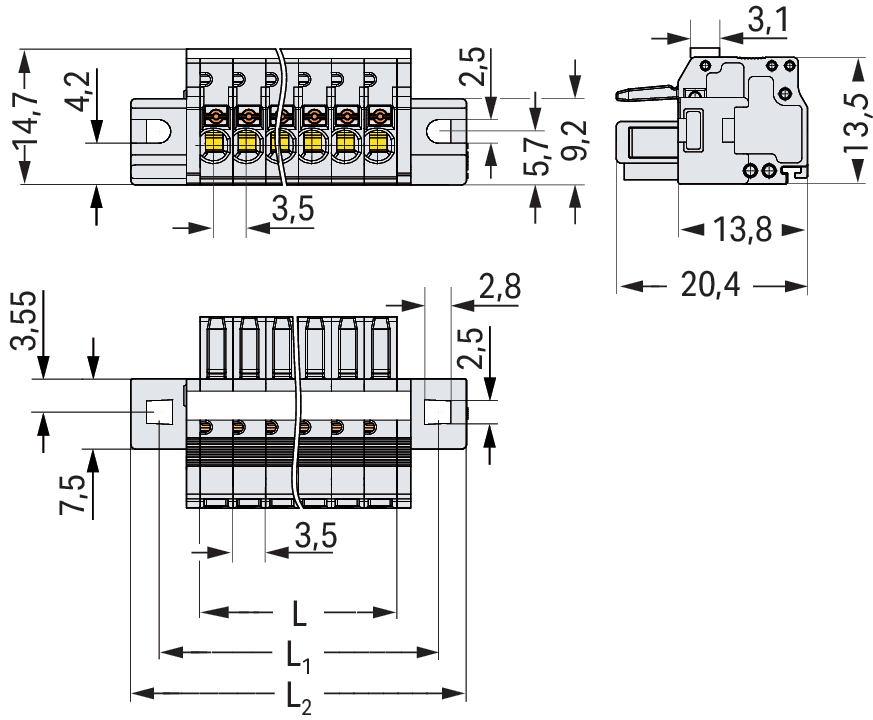 gniazdo 1-przewodowe; przycisk; Push-in CAGE CLAMP®; 1,5 mm²; raster 3,5 mm; 20-bieg.; 100% ochrona przed błędnym połączeniem; kołnierz mocujący; 1,50 mm²; jasnoszary