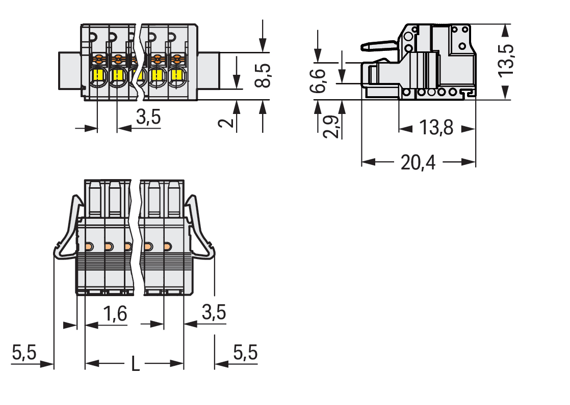 gniazdo 1-przewodowe; przycisk; Push-in CAGE CLAMP®; 1,5 mm²; raster 3,5 mm; 24-bieg.; 100% ochrona przed błędnym połączeniem; boczne zaczepy ryglujące; 1,50 mm²; jasnoszary
