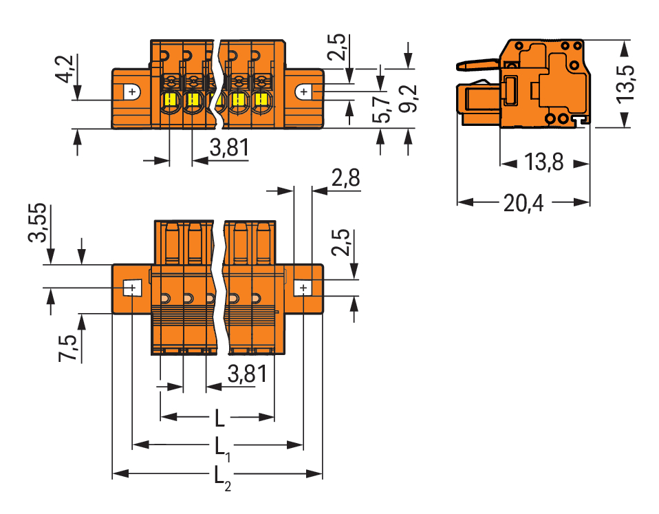 gniazdo 1-przewodowe; przycisk; Push-in CAGE CLAMP®; 1,5 mm²; raster 3,81 mm; 5-bieg.; 100% ochrona przed błędnym połączeniem; kołnierz mocujący; 1,50 mm²; pomarańczowy