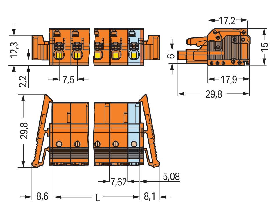gniazdo 1-przewodowe; przycisk; Push-in CAGE CLAMP®; 2,5 mm²; raster 7,62 mm; 4-bieg.; boczne zaczepy ryglujące; 2,50 mm²; pomarańczowy
