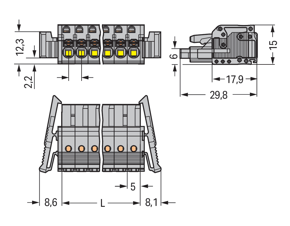 gniazdo 1-przewodowe; przycisk; Push-in CAGE CLAMP®; 2,5 mm²; raster 5 mm; 8-bieg.; boczne zaczepy ryglujące; 2,50 mm²; szary