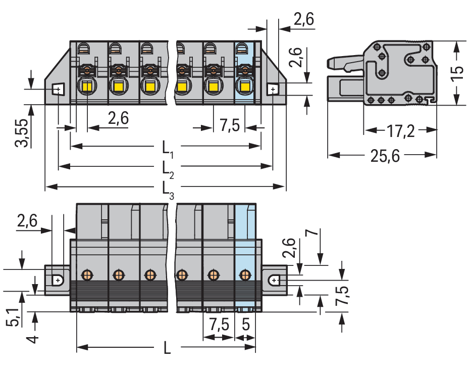 gniazdo 1-przewodowe; przycisk; Push-in CAGE CLAMP®; 2,5 mm²; raster 7,5 mm; 8-bieg.; kołnierz mocujący; 2,50 mm²; szary
