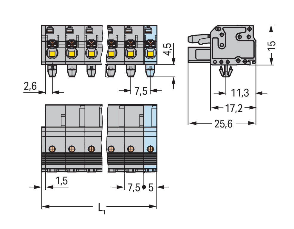 gniazdo 1-przewodowe; przycisk; Push-in CAGE CLAMP®; 2,5 mm²; raster 7,5 mm; 11-bieg.; stopki zatrzaskowe; 2,50 mm²; szary