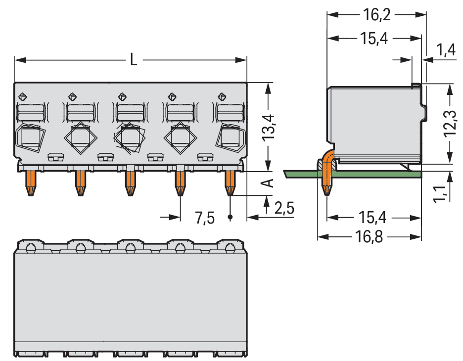 gniazdo THR 1-przewodowe kątowe; przycisk; Push-in CAGE CLAMP®; 2,5 mm²; raster 7,5 mm; 3-bieg.; pin lutowniczy Ø 1,4 mm; 2,50 mm²; jasnoszary