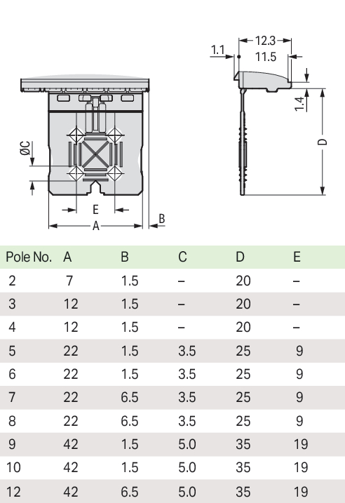 gniazdo THT 1-przewodowe proste; przycisk; Push-in CAGE CLAMP®; 2,5 mm²; raster 5 mm; 5-bieg.; pin lutowniczy Ø 1,4 mm; płytka odciążająca; 2,50 mm²; jasnoszary