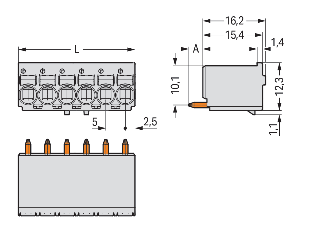 gniazdo THR 1-przewodowe proste; przycisk; Push-in CAGE CLAMP®; 2,5 mm²; raster 5 mm; 3-bieg.; pin lutowniczy Ø 1,4 mm; 2,50 mm²; jasnoszary