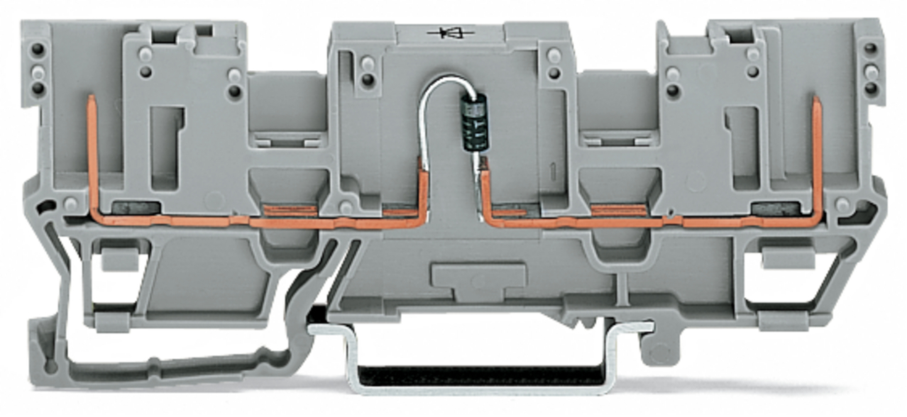 2-pinowa zł. bazowa do zabudowy element.; z podwójnym mostkowaniem; z diodą 1N4007; anoda po prawej; na szynę TS 35 x 15 i 35 x 7,5; 4 mm²; szary