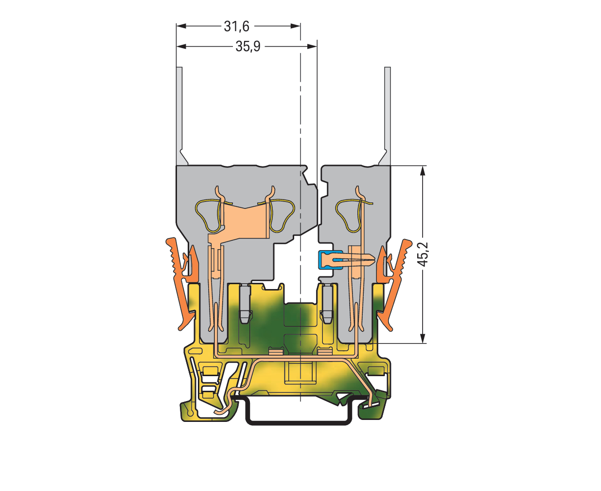 złączka bazowa PE 2-pinowa; na szynę TS 35 x 15 i 35 x 7,5; żółto-zielony
