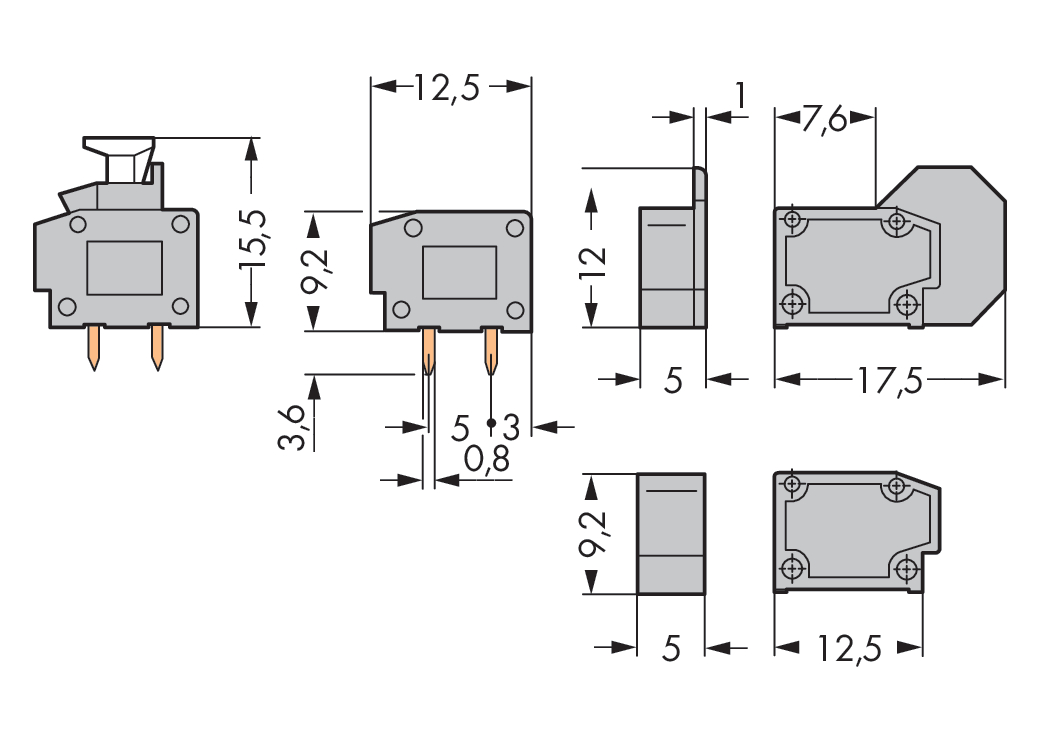 2-przew modul zł do płytek druk 0,75 mm² RM 5/5,08 mm 1-bieg, szara 235-711/333-000