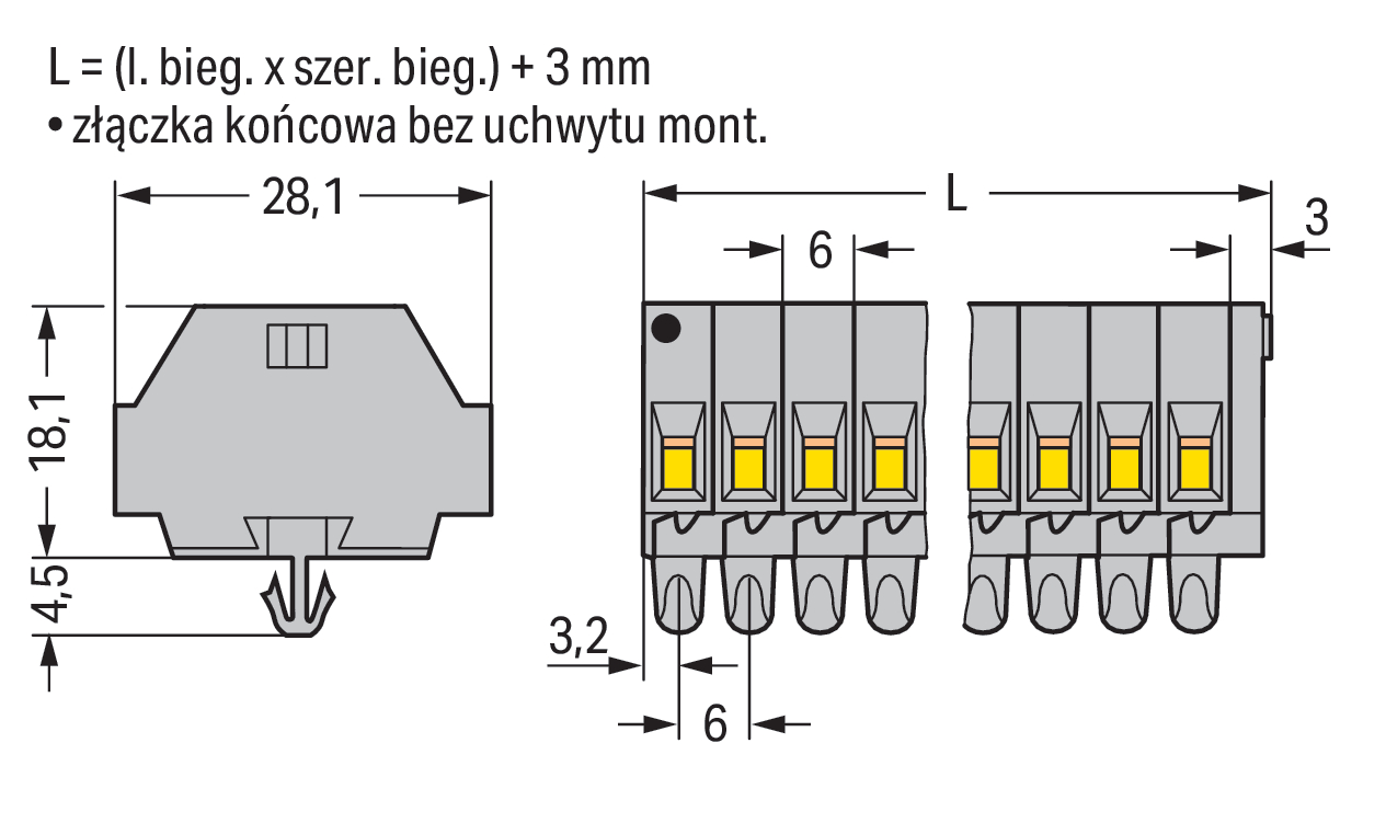 listwa zaciskowa 2-przewodowa; bez przycisków; ze stopkami zatrzaskowymi; 12-bieg.; do płyty o grubości 0,6 ... 1,2 mm; otwór montażowy Ø 3,5 mm; 2,5 mm²; CAGE CLAMP®; 2,50 mm²; szary