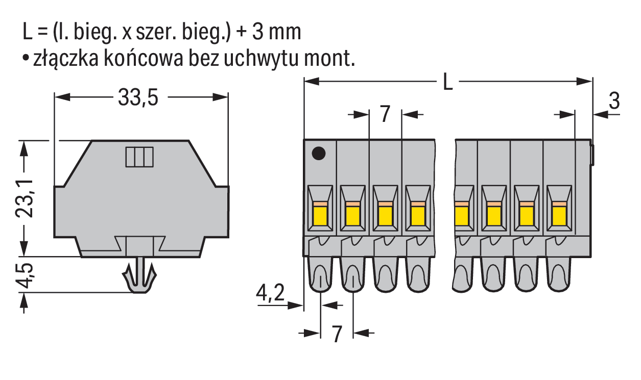 listwa zaciskowa 2-przewodowa; bez przycisków; ze stopkami zatrzaskowymi; 12-bieg.; do płyty o grubości 0,6 ... 1,2 mm; otwór montażowy Ø 3,5 mm; 4 mm²; CAGE CLAMP®; 4,00 mm²; szary