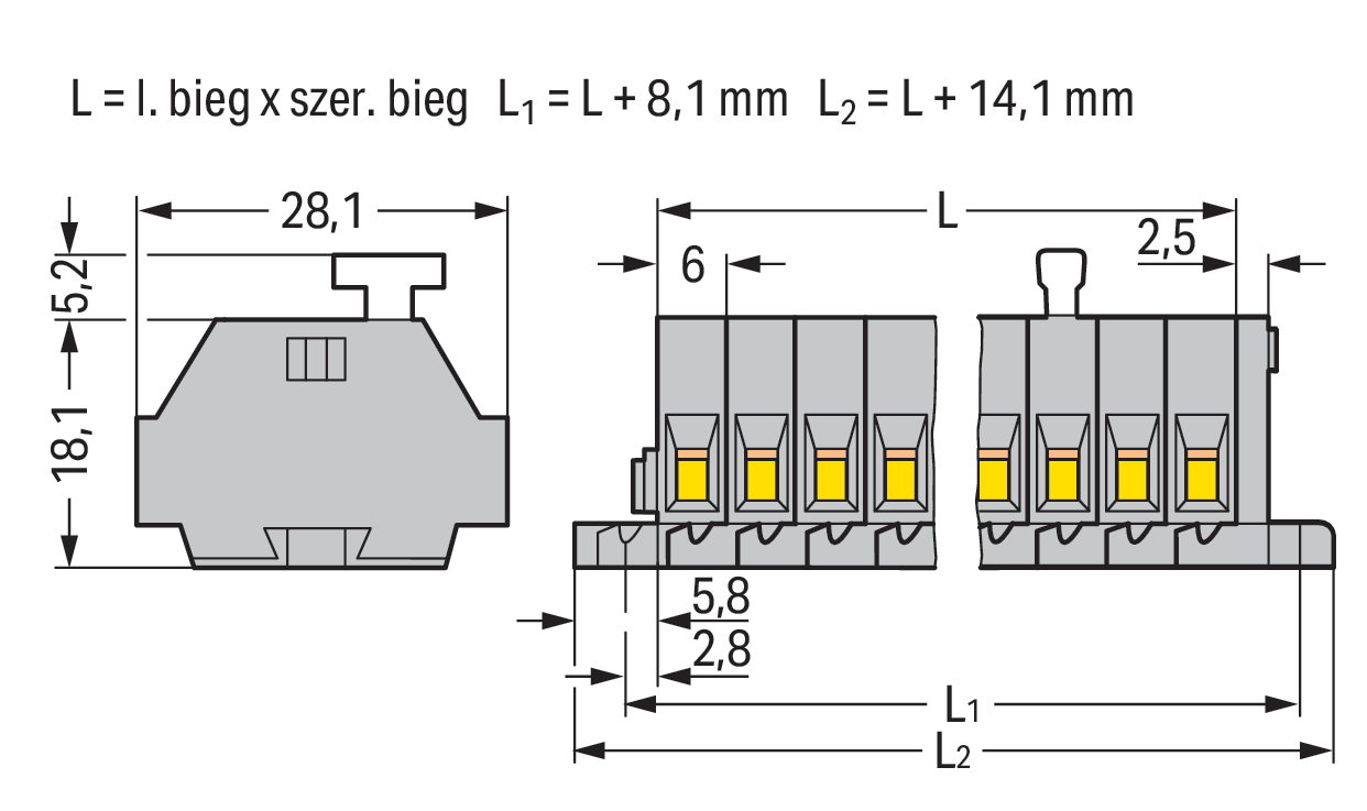 2-przewodowa listwa zaciskowa 2-bieg., szara 261-102/331-000