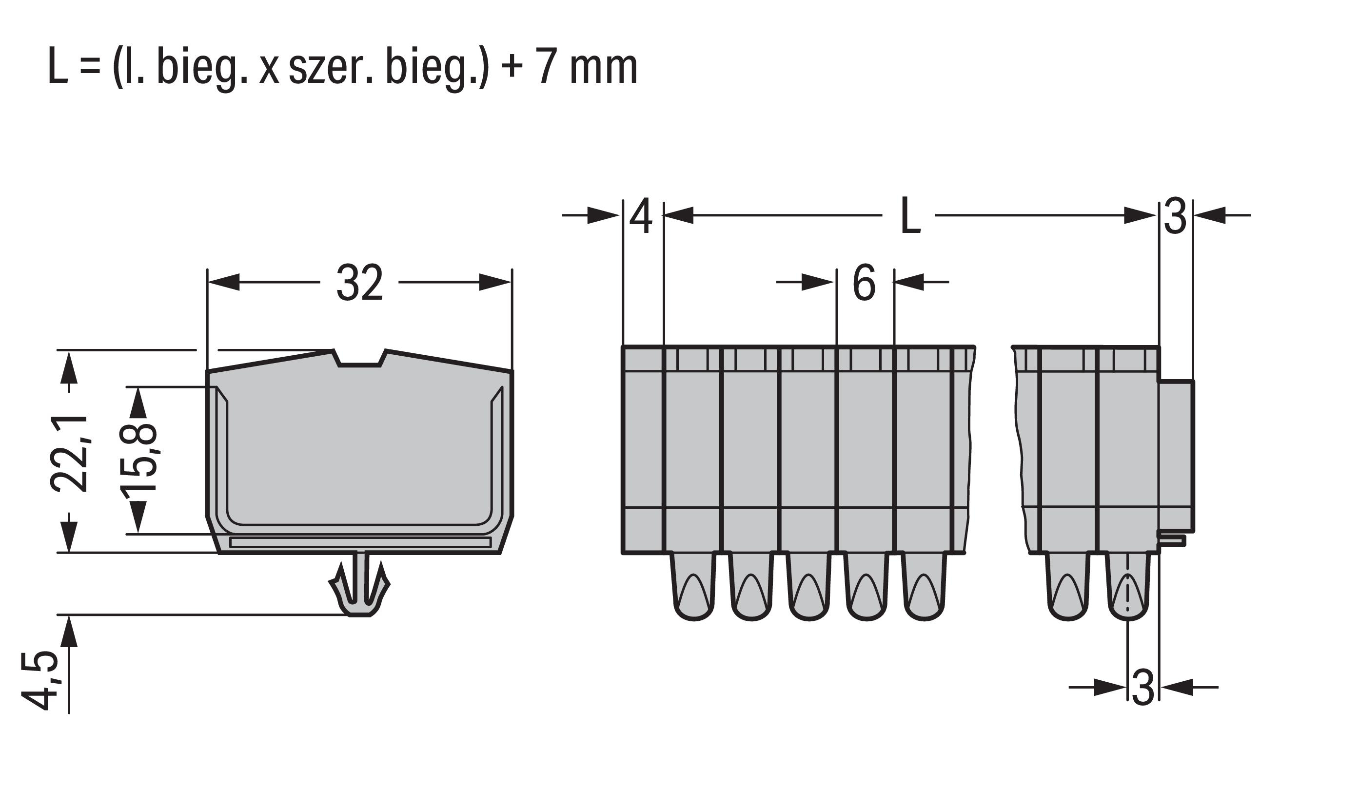 listwa zaciskowa 2-przewodowa; bez przycisków; ze stopkami zatrzaskowymi; 4-bieg.; do płyty o grubości 0,6 ... 1,2 mm; otwór montażowy Ø 3,5 mm; 2,5 mm²; CAGE CLAMP®; szary