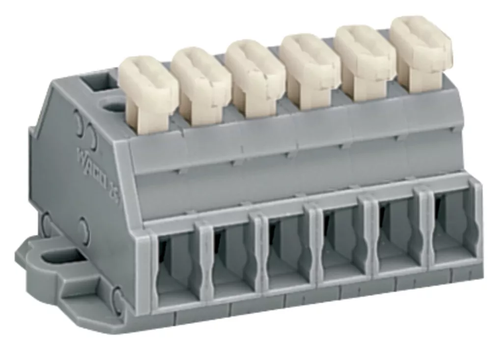 listwa zaciskowa 2-przewodowa; przyciski po jednej stronie; z uchwytami montażowymi; 6-bieg.; do mocowania śrubowego i podobnego typu; otwór montażowy Ø 3,2 mm; 2,5 mm²; CAGE CLAMP®; szary