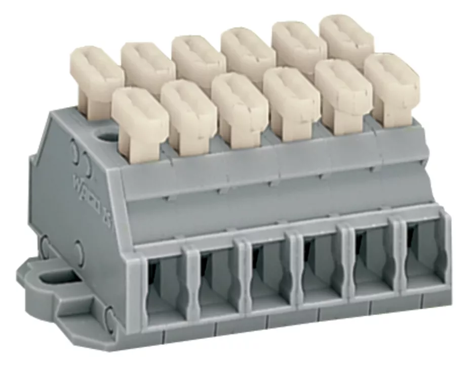 listwa zaciskowa 2-przewodowa; przyciski po obu stronach; z uchwytami montażowymi; 6-bieg.; do mocowania śrubowego i podobnego typu; otwór montażowy Ø 3,2 mm; 2,5 mm²; CAGE CLAMP®; szary