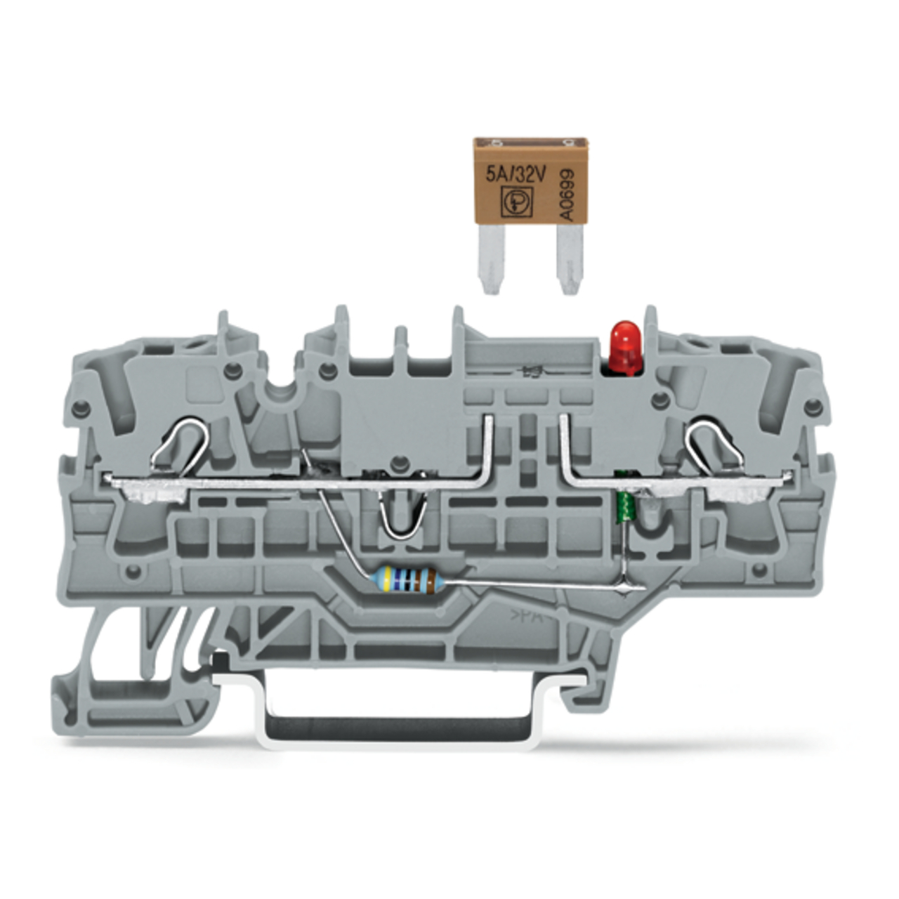 złączka bezpiecznikowa 2-przewodowa; do pł. bezpiecz. samochod. Mini; z możliwością pomiaru; z sygnalizacją przepalenia wkładki przez LED; 24 V; na szynę TS 35 x 15 i 35 x 7,5; 2,5 mm²; Push-in CAGE CLAMP®; szary