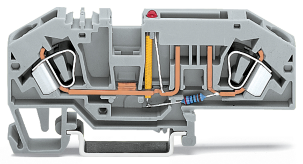 złączka bezpiecznikowa 2-przewodowa; do płaskich bezpieczników samochodowych; z możliwością pomiaru; z sygnalizacją przepalenia wkładki przez LED; 24 V; na szynę TS 35 x 15 i 35 x 7,5; 6 mm²; CAGE CLAMP®; szary