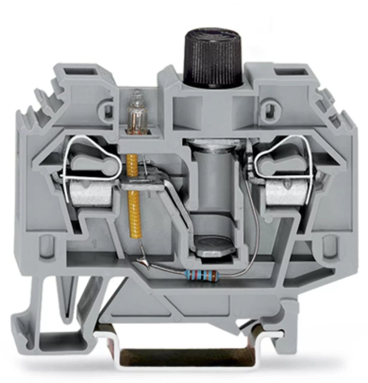 złączka bezpiecznikowa 2-przewodowa; do aparatowej wkładki bezpiecznikowej ¼" x 1¼"; z sygnalizacją przepalenia wkładki przez neonówkę; na szynę TS 35 x 15 i 35 x 7,5; 6 mm²; CAGE CLAMP®; szary